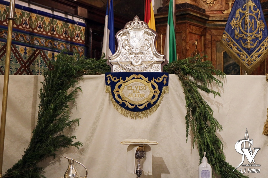 Las barandas del altar presentaban una estampa novedosa, al estar cubiertas éstas con un damasco de color blanco, similar al tisú del Simpecado de la Santísima Virgen. Estas barandas estaban embellecidas en la parte central, además, por los frontales de los bueyes de la carreta, con terciopelo azul y tisú blanco bordados en oro, además de la pieza de orfebrería en cuyo diseño se contiene el escudo de El Viso del Alcor. Alrededor de estas piezas habían guirnaldas realizadas con tuyas verdes, un tipo de planta que tiene mucha presencia en el Parque de la Muela de El Viso del Alcor, por donde pasa la Filial nº 121 de la de Almonte cuando inicia su camino en la Romería del Rocío. Completaban el altar las banderas de El Viso del Alcor, España y Andalucía, además del banderín del Grupo Joven y el estandarte de la Hermandad.