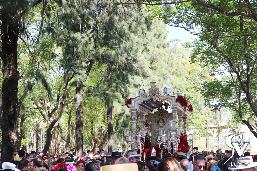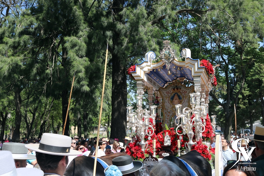 Cuando llegó el Simpecado al final del Parque de La Muela, junto a la gran fuente redonda, se procedió al Rezo del Ángelus, que este año se realizó a las 11:30 horas, aproximadamente media hora antes de lo habitual. En este punto, El Viso del Alcor despidió a su Hermandad del Rocío, una corporación que lleva el nombre de la localidad a gala, y que 5 días después hizo su presentación ante la Hermandad Matriz de Almonte, como momento culmen del camino realizado.