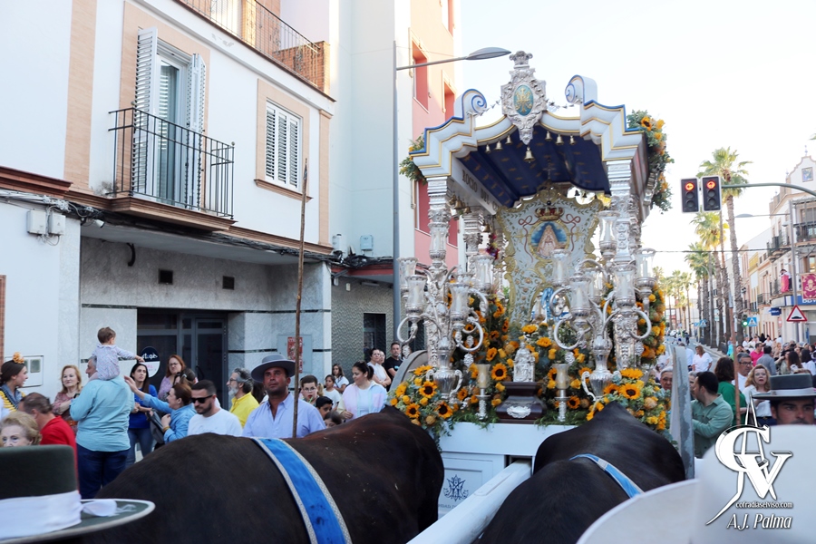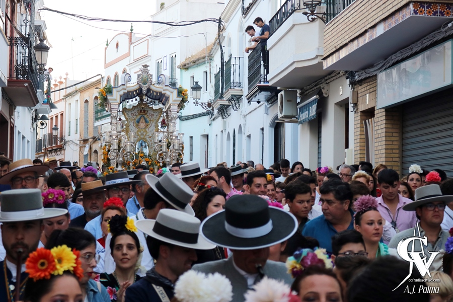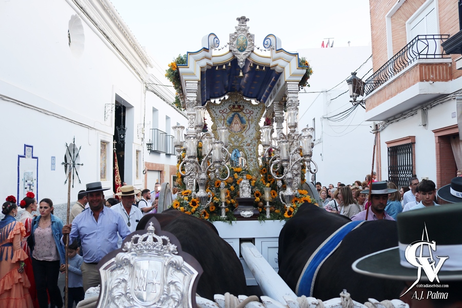La llegada de la Hermandad convirtió la localidad en una fiesta allá por donde los peregrinos visueños pasaban, siempre acompañando al Simpecado de la Santísima Virgen. Aproximadamente, sobre las 20:00 horas entraba la comitiva en la localidad, entrando por la Avenida de Carlos Cano, recorriendo posteriormente Avenida 12 de Septiembre, Corredera, Rosario, Santa María del Alcor, Plaza Padre Nicasio y Manuel Roldán «El Campanero» hasta efectuar su entrada en el templo parroquial sobre las 22:00 horas.