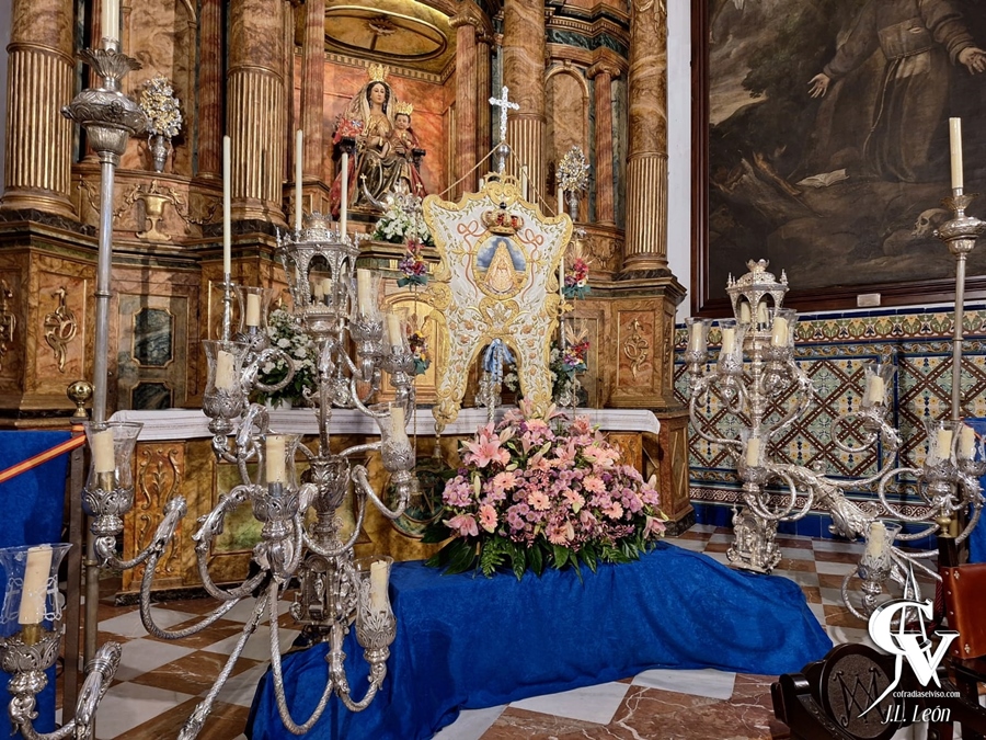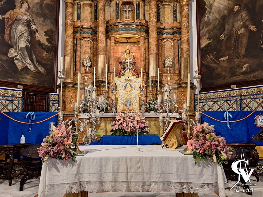Para la ocasión, la priostía de la corporación rociera montó en la Iglesia Parroquial de Santa María del Alcor, su sede canónica, un altar efímero sencillo, pero vistoso y elegante a la vez. El Simpecado de la Santísima Virgen era el centro de todas las miradas presidiendo el altar, sin doseles ni otros elementos custodiándolo, colocado a los pies del retablo mayor. Solo había un pedestal cubierto por un damasco azul, sobre el que se elevaba el Simpecado, que tenía a sus plantas un gran ramo de flores variadas en tonalidades rosas con algo de verde. Además, en las esquinas de la mesa del altar habían ramos de flores similares al ya mencionado, siendo los de la mesa del altar de menor tamaño.