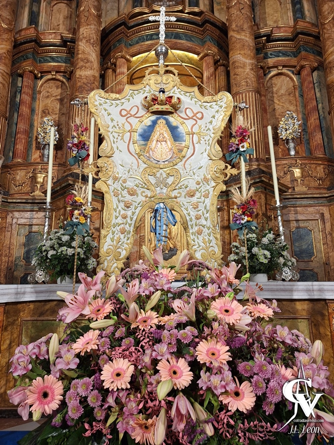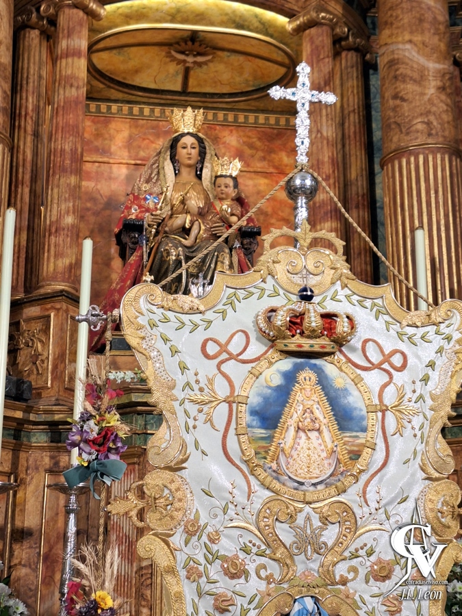 Para finalizar el montaje, las barandas del altar mayor tenían unas colgaduras de damasco azul con el escudo de la Filial nº 121 de la de Almonte en su parte central, engalanadas además con distintas banderas, como la de España colocada a modo de guirnalda y la de El Viso del Alcor colocada en forma de lazo.