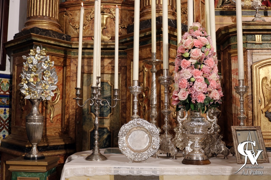 La priostía de la corporación carmelita aprovechó para hacer un cambio en las flores del altar, pasando de ramos compuestos por flores en tonalidades blancas durante los días previos a otros compuestos por flores en tonalidades rosas, pasando de 2 a 4 ramos de este tipo en el altar. Igualmente, la priostía de la Hermandad colocó pedestales marmoleados flanqueando el plan de altar, sobre los que se colocaron jarras con flores de talco. Por su parte, los puntos de luz y la platería se mantuvo de la misma forma durante el besamanos.