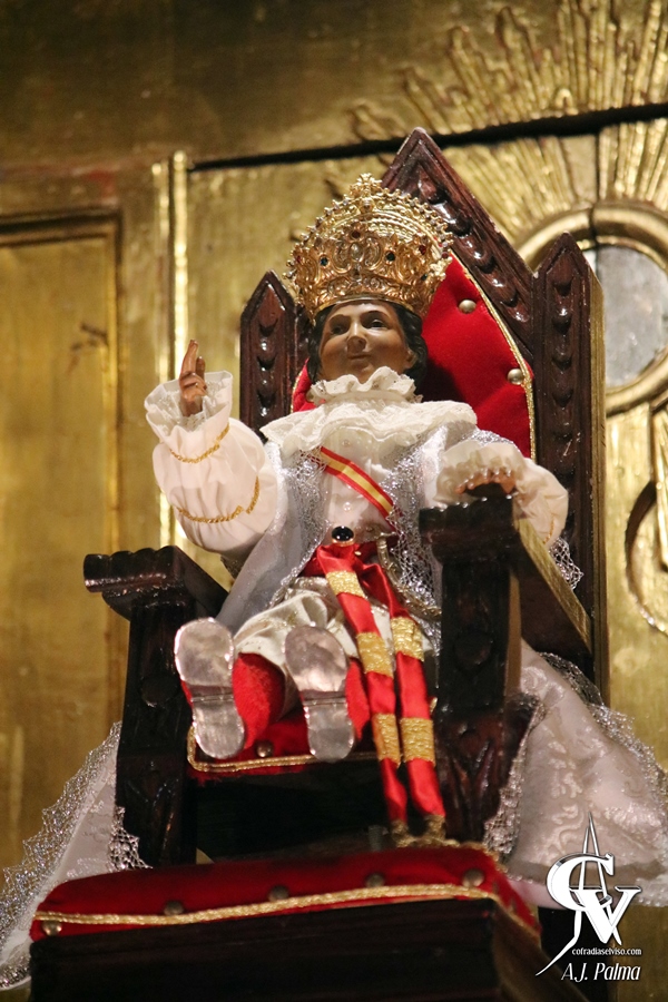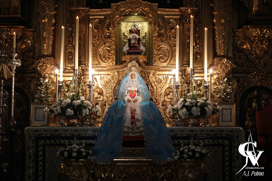 Para ello, la Santísima Virgen se encontraba ubicada en el presbiterio del templo conventual, sobre una peana procedente de la canastilla del antiguo paso de Nuestro Padre Jesús Nazareno, de la Hermandad de Jesús Nazareno. Ahí, la Virgen de los Reyes aguardaba a los fieles ataviada con manto celeste de brocado, saya blanca, toca de sobremanto y pecho recubierto de distintos elementos de joyería. Por su parte, el Divino Infante, vestido igualmente de blanco, se encontraba en el manifestador del retablo mayor de este templo, sentado sobre un trono que la Asociación suele utilizar para este tipo de cultos.