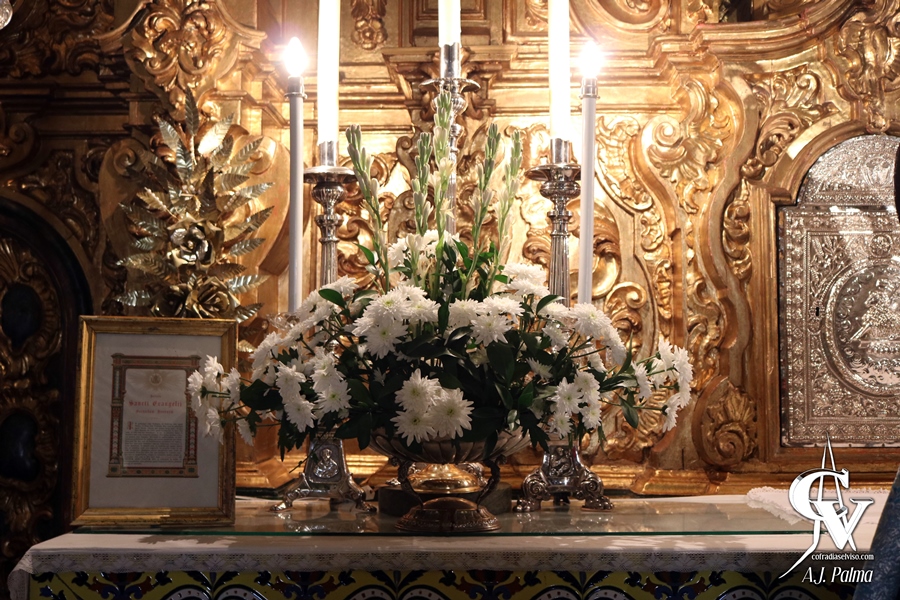 El altar, sencillo en su montaje, estaba iluminado por cuatro puntos de luz eléctricos, además por seis puntos de luz de cera. Respecto al exorno floral, cuatro ramos se encontraban distribuidos por el altar, compuestos de flores blancas, varas de nardos y algo de verde.