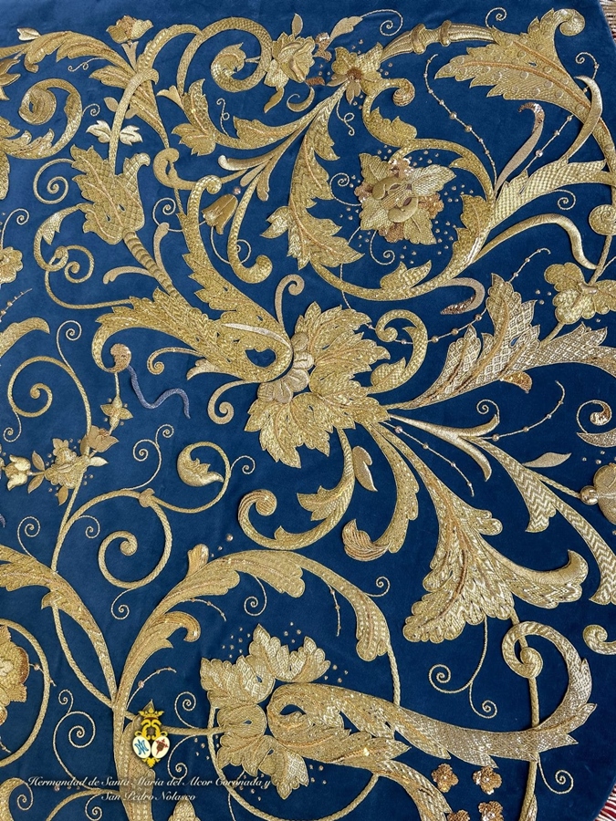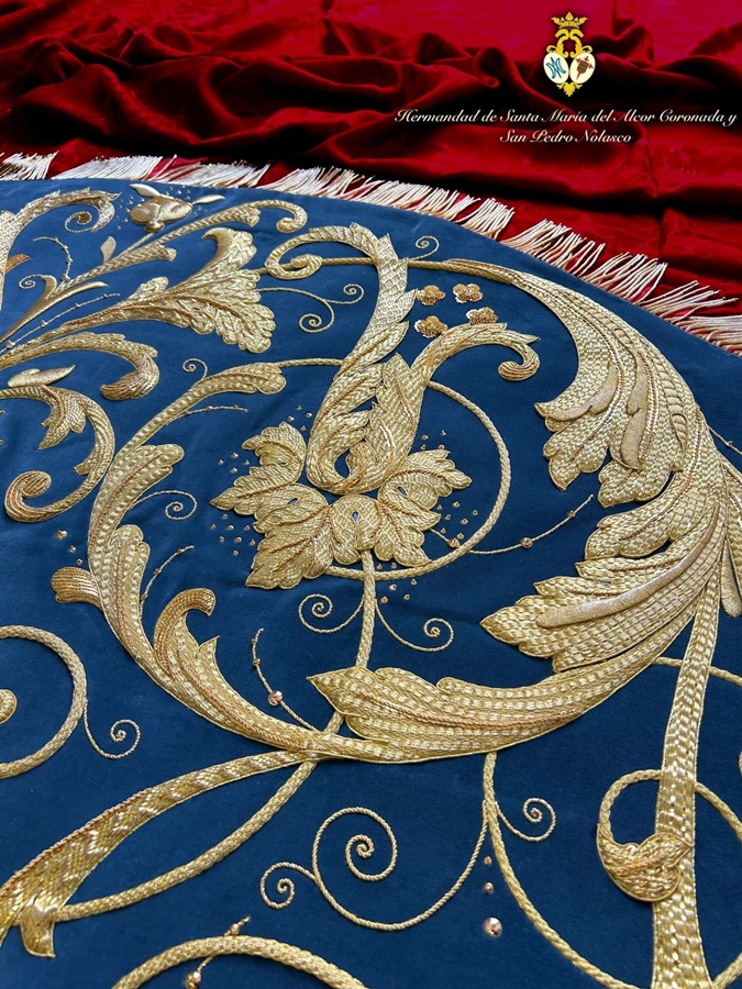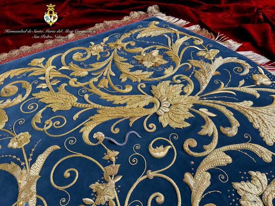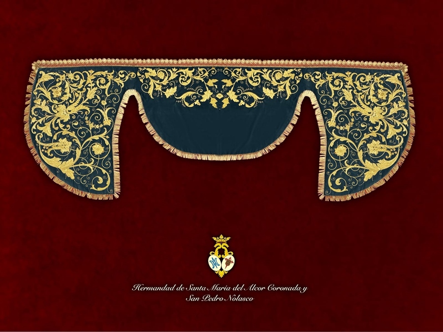 La obra, realizada en terciopelo azul grisáceo, ha sido realizada por el prestigioso taller de bordados de D. Daniel Prieto, de la localidad onubense de Lepe, siguiendo un diseño realizado por D. Álvaro Abril Vela. Toda la traza del diseño sigue motivos vegetales y formas asimétricas, predominando grandes hojarascas, flores y tallos entrelazados y piezas superpuestas entre sí, obteniendo volúmenes y realces propios del oficio tradicional del bordado, todo ello enriquecido con una multitud de caracoles. El material utilizado para el soporte ha sido escogido con la intención de que, una vez bordada la obra, no se oscureciese mucho este soporte, destacando el cambio de tonalidad percibida según reciba la luz.