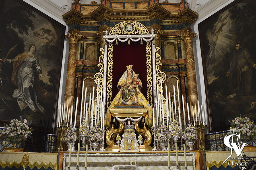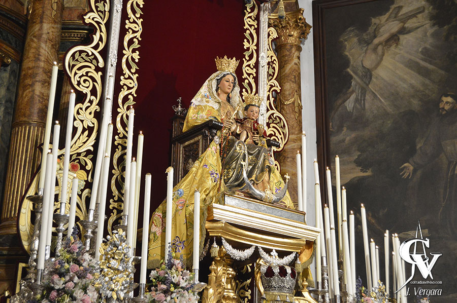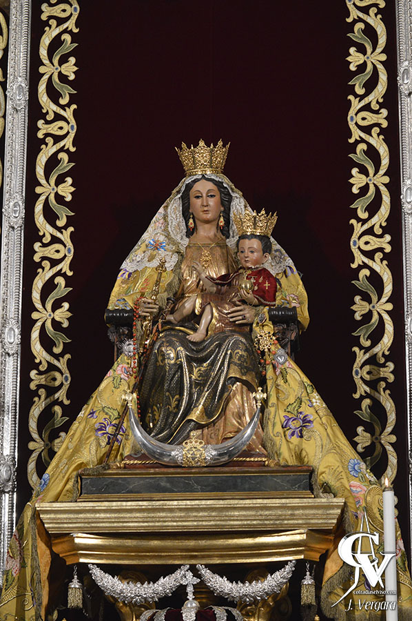 Como cada mes de septiembre, la Reina de los Alcores espera a todos sus fieles desde su gran altar de cultos, que sigue el plan de altar establecido por la Hermandad desde hace varios años, ataviada con un manto dorado bordado en sedas de colores.