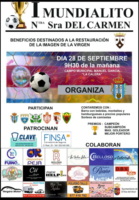 El C.D. Atlético Viso, uno de los clubes de fútbol de nuestra localidad, organiza para este sábado 28 de septiembre el I Mundialito «Nuestra Señora del Carmen», en el que participarán distintos clubes de fútbol de la provincia de Sevilla.