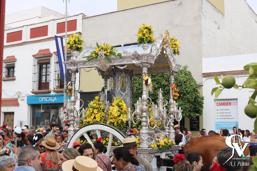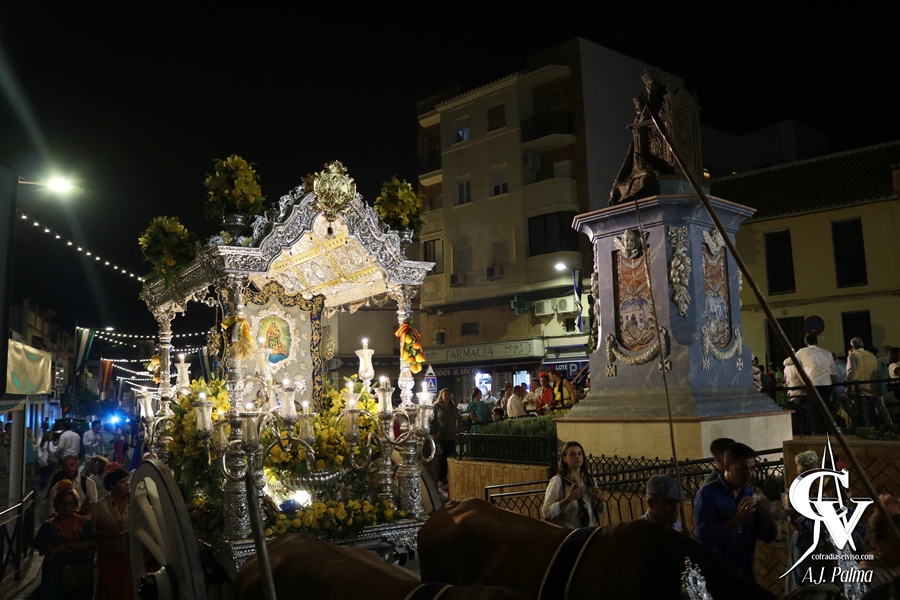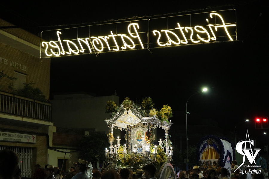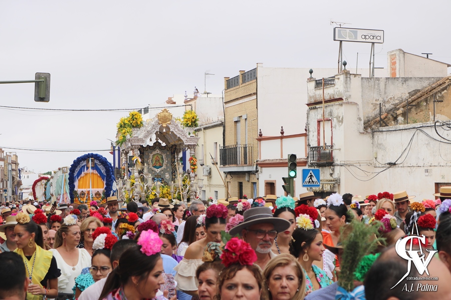 El camino de vuelta a la localidad, como es tradicional, fue por la carretera A-398 en dirección a El Viso del Alcor, efectuando su entrada en la localidad sobre las 20:00 horas por la Avenida del Trabajo. Ya de noche, la comitiva continuaría su camino por las calles Corredera y Rosario, pasando la carreta del Simpecado por delante del Triunfo a Santa María del Alcor en los últimos metros de la Romería. De hecho, a partir de este punto del recorrido, solo acompañaron al Simpecado romeros a pie, tras haber sido acompañado tanto a la ida como a la vuelta por los mencionados jinetes a caballo, carrozas y demás vehículos.