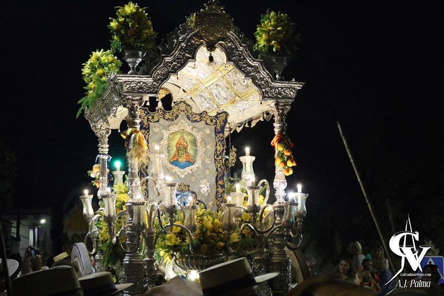 Finalmente, a eso de las 22:30 horas, el Simpecado efectuaba la entrada en la Capilla del Rosario, donde recibe culto diario durante todo el año, tras haber sido bajado de la carreta en un momento de mucho recogimiento tras el fervor y la alegría de las horas previas. Hasta ese momento, no faltaron las sevillanas, los vivas, los cantes y los bailes, además del típico sonido de los tamborileros que acompañaban al Simpecado.