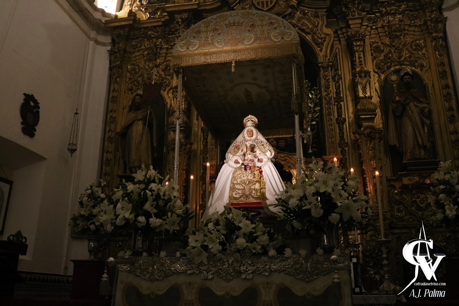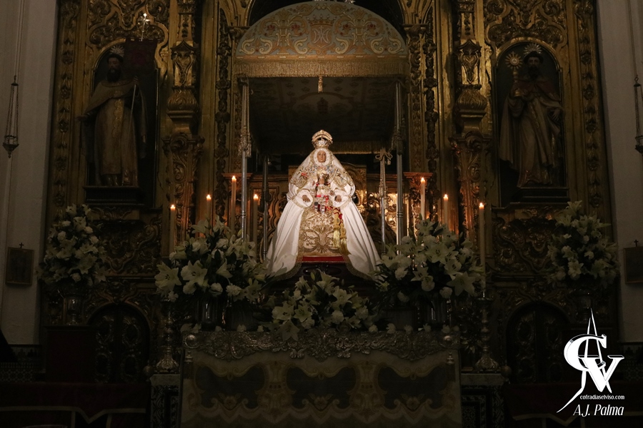 Así, a principios de diciembre la Virgen de los Reyes fue subida a su paso de tumbilla, para presidir así el altar montado por esta Asociación para el Solemne Triduo y la Solemne Función, que se celebraron entre los días 4 y 7 de diciembre en la Iglesia Conventual del Corpus Christi, su sede canónica. La Santísima Virgen lucía saya blanca bordada, manto blanco y toca de sobremanto, portando además distintas joyas en el pecherín.