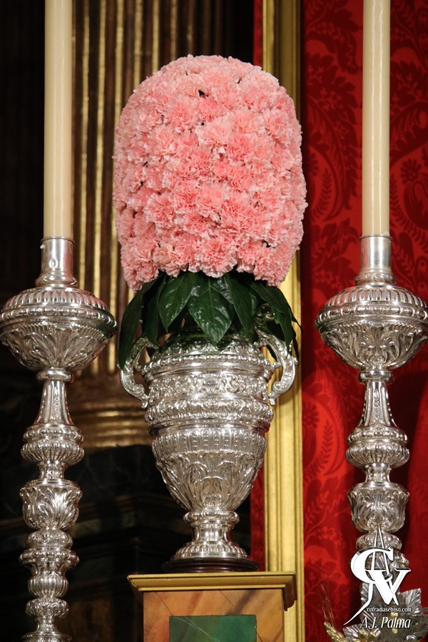 Todo el frontal del altar era marmóreo, lo cual aportaba una armonía al altar, a la vez que destacaba a las Sagradas Imágenes. Estas se encontraban flanqueadas por puntos de luz, e, incluso, en el caso del Señor, por jarras de flores. Todo el exorno floral del altar, tanto en las jarras a los lados del Señor como en los ramos a los pies de la Virgen de la Paz y del Apóstol Santiago, estuvo compuesto por claveles de color rosa, una flor muy característica de esta cofradía, acompañado por algo de verde.