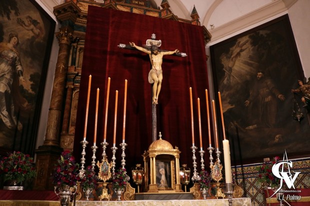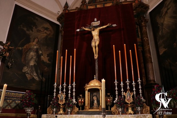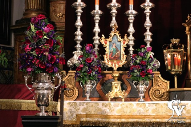 La cera se disponía en el altar de forma simétrica, colocando cinco candelabros a cada lado de la Sagrada Imagen, dispuestos sobre unas estructuras ornamentadas marmóreas. Justo delante de estas estructuras se encontraban unas pinturas de San Juan Evangelista y Santa María Magdalena, teniendo estas a cada lado jarras con ramos de flores variadas. Dos jarras más se encontraban colocadas en el presbiterio del templo, sobre unos pedestales marmóreos. Por su parte, el frontal del altar estaba confeccionado en terciopelo negro con estrellas incrustadas, mientras que las barandas del altar mayor tenían unas colgaduras de damasco rojo con galones.