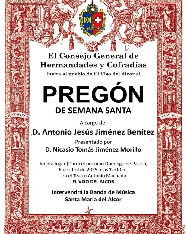 Este domingo 6 de abril es el conocido como Domingo de Pasión, o también como Domingo de Pregón. En esta jornada, el Consejo General de Hermandades y Cofradías de El Viso del Alcor celebrará el Pregón de la Semana Santa 2025, para anunciar la Pasión, Muerte y Resurrección del Señor en nuestra localidad cuando tan solo falta una semana para el Domingo de Ramos.