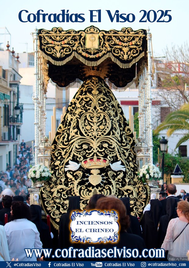 En la parte superior se puede leer en letras azules “Cofradías El Viso 2025” y en la parte inferior recoge la dirección web del portal cofrade y las redes sociales en una franja azul. Además, este cartel cuenta con la publicidad de Inciensos El Cirineo, a quien agradecemos su colaboración por tercer año consecutivo.