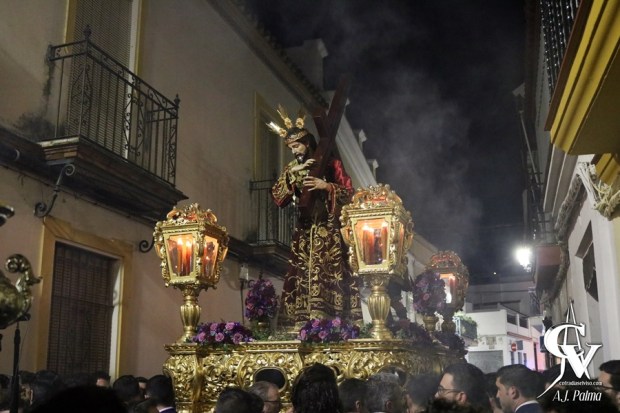 Una vez en el Mirador del Calvario, un sexteto de metales y caja de Mairena del Alcor sustituyó al trío de música de capilla, interpretando distintas adaptaciones de marchas de banda de música, de corte clásico o solemne. De esta forma, con la caída de la noche, las andas recorrieron las calles Nuestro Padre Jesús Nazareno, Carmona, Albaicín, Conde de Castellar, Plaza Sacristán Guerrero y Convento. Sobre las 21:30 horas, la Sagrada Imagen llegaba a su sede canónica, efectuando una entrada casi tan dificultosa como la de cada Viernes Santo, debido a las dimensiones del dintel de la puerta.