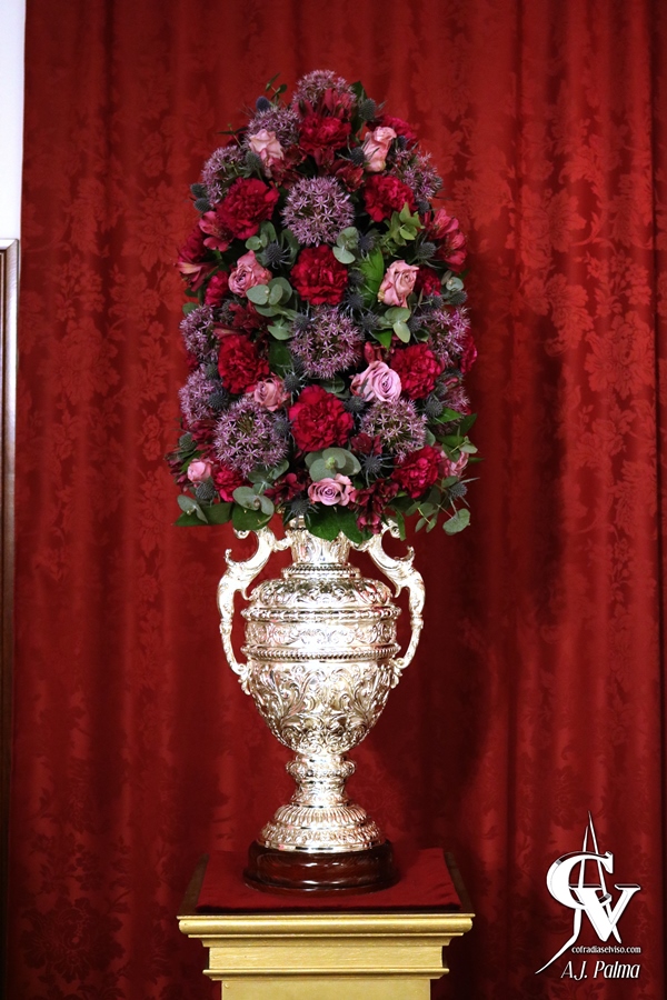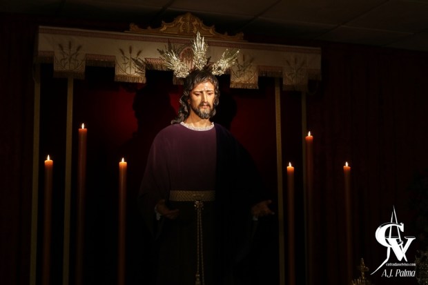 A cada lado del Señor de la Redención, que lucía para la ocasión túnica de sarga morada con mantolín de terciopelo morado, se colocaron tres candelabros con cera de color tinieblas, dispuestos de forma simétrica. A su vez, a ambos lados del altar se encontraban unos pedestales dorados sobre los que se dispusieron jarras con ramos de flores, cuyo exorno estuvo compuesto por rosas de color rosa claro, claveles rojos y otras flores de tonos morados, completando los ramos con algo de verde. Todo este conjunto estaba enmarcado por un gran dosel de damasco en color rojo.