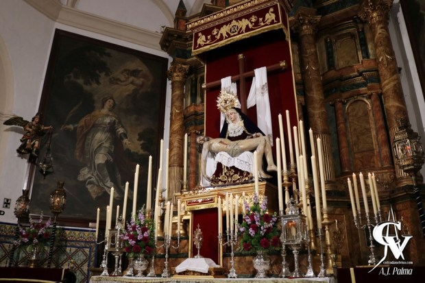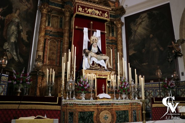 Tanto el frontal del banco del altar como las gradas estaban realizadas en madera marmórea, de un estilo similar al del retablo mayor del templo parroquial, lo que hacía que visualmente quedase muy integrado este montaje en el presbiterio. La candelería, con cera de color blanco, se distribuía sobre estas gradas de forma piramidal y simétrica, llevando la mirada hacia el Cristo de la Buena Muerte y la Virgen de la Piedad, que lucía manto de terciopelo morado y saya de terciopelo burdeos bordada en oro. Para ello, se utilizaron candelabros de madera dorada junto a otros de orfebrería.