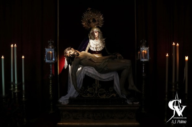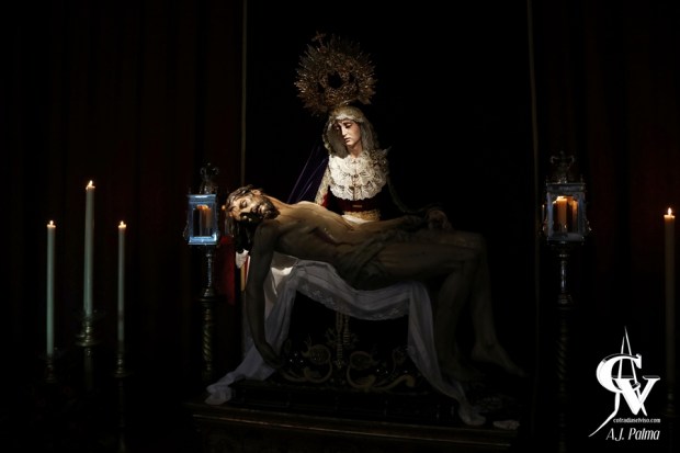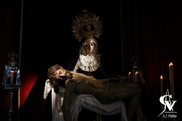 El Santísimo Cristo de la Buena Muerte y Nuestra Señora de la Piedad permanecieron esos días cobijados bajo el dosel de cultos que la Hermandad posee, dispuestos sobre su peana dorada de cultos y flanqueados por unas columnas sobre las que se colocaron faroles para dar algo de luz en la intimidad de este lugar. Un foco iluminaba en la penumbra los rostros de las Sagradas Imágenes, invitando a la oración.