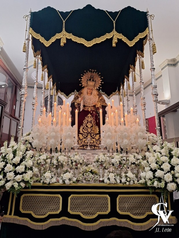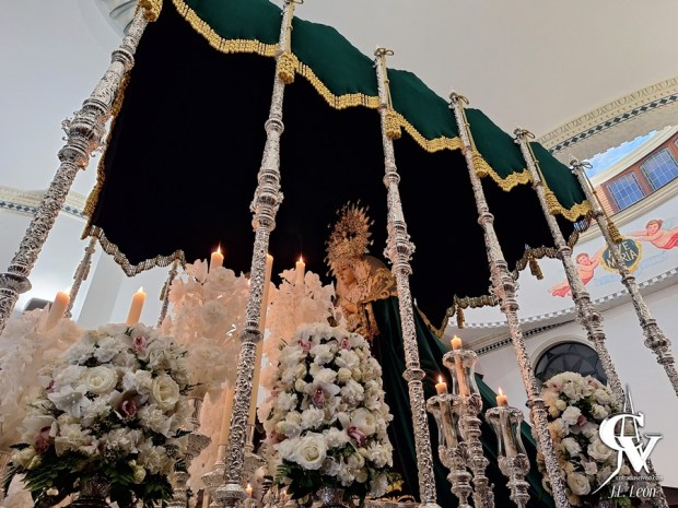 En cuanto los hermanos desalojaron la Casa de Hermandad, este lugar quedó abierto para que los fieles y devotos pudieran acercarse a venerar a la Virgen de la Esperanza, que durante esos días se encontraba alejada de sus vecinos de la Barriada del Carmen, donde tiene su sede canónica. La Santísima Virgen lucía la saya del XXV Aniversario, portando en su pecho la Medalla de Oro de la Villa que recibió el 12 de octubre de 2024 en la Iglesia Parroquial de Santa María del Alcor. Además, el exorno floral estaba compuesto por flores de tonos blancos con algo de verde, entre las que destacaban las rosas, entre otras.