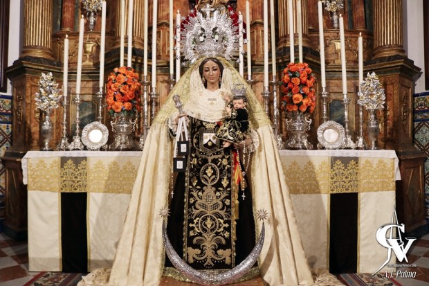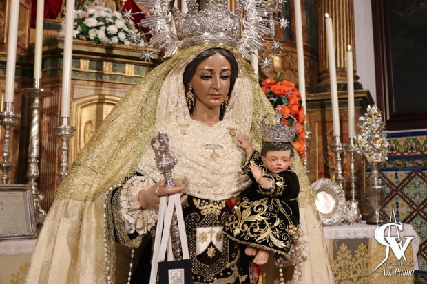 Justamente el día 15 de julio, coincidiendo con la última jornada del Solemne Septenario, la Virgen del Carmen baja del altar ubicado en el presbiterio del templo parroquial. La candelería del altar se mantenía dispuesta de forma similar, manteniendo también las credenciales y las piezas de platería. Por su parte, la Sagrada Imagen era colocada en una peana recubierta por un damasco de color crema, justo delante del montaje.
