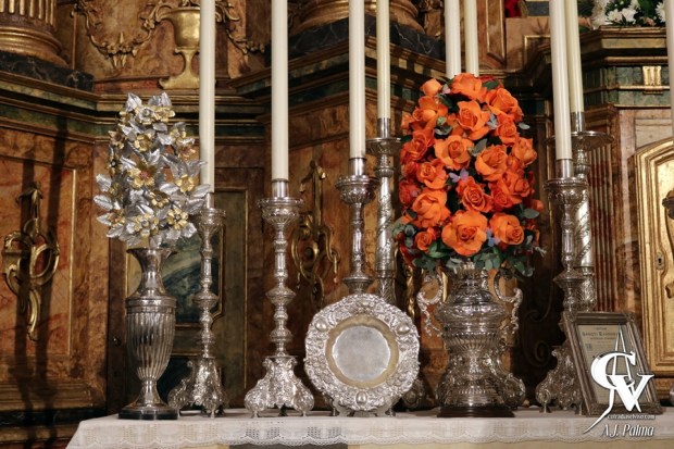 Algo que llamó mucho la atención de este montaje fue el cambio del exorno floral. Tras un exorno compuesto por flores en tonos rosas, para esta veneración el exorno floral estaba compuesto por ramos con rosas de color naranja, algo de verde y unas mariposas artificales que aparecían entre las distintas rosas. Unos ramos que destacaron por su originalidad, tras haber tenido unos ramos más clásicos los días previos.