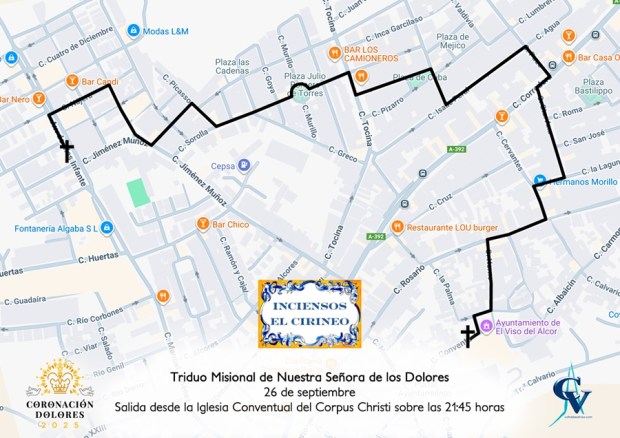 El Triduo Misional comenzará este jueves 25 de septiembre con el primero de los traslados de la Sagrada Imagen, que visitará el Barrio del Calvario para llegar a la Iglesia Conventual del Corpus Christi. De esta forma, la Virgen de los Dolores saldrá de la Iglesia Parroquial de Santa María del Alcor a las 21:00 horas, recorriendo Manuel Roldán «El Campanero», Amargura, Albaicín, Calvario, Virgen del Mayor Dolor, Cristo del Amor, Virgen de los Dolores, Jesús Nazareno, Rosario, Jesús Cautivo, Albaicín, Conde de Castellar, Plaza Sacristán Guerrero y Convento, para efectuar la entrada en el templo mercedario, donde pasará la primera noche.