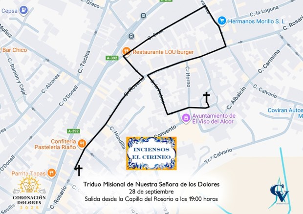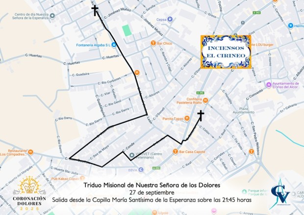 De esta forma, el domingo 28 de septiembre a las 19:00 horas comenzará el regreso de Nuestra Señora de los Dolores al templo parroquial, transitando por las calles Rosario, Maestro Seri, Cruz, Cervantes, Rosario, La Palma, Plaza Sacristán Guerrero, Santa María del Alcor y Manuel Roldán «El Campanario». Para este último traslado, la Santísima Virgen será acompañada por la Banda de Música Santa María del Alcor.