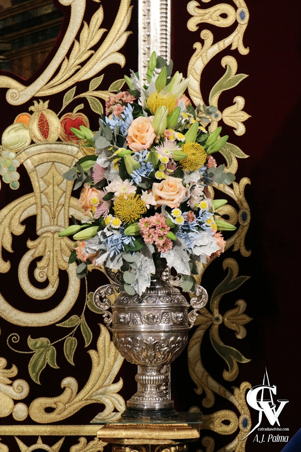 El dosel estaba flanqueado por dos pilastras marmóreas sobre las que se colocaron candelabros antiguos con cera blanca. En el lado izquierdo del altar según se mira se encontraba una mesa con un cojín azul, sobre los que se encontraban atributos de la Sagrada Imagen, como el cetro de la Virgen y la bola del mundo del Divino Infante. Respecto al exorno floral, sobre dos columnas salomónicas se encontraban jarras de flores, siendo estos ramos de distintas flores en tonos variados, dándole un mayor toque de alegría y color al montaje.