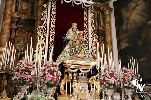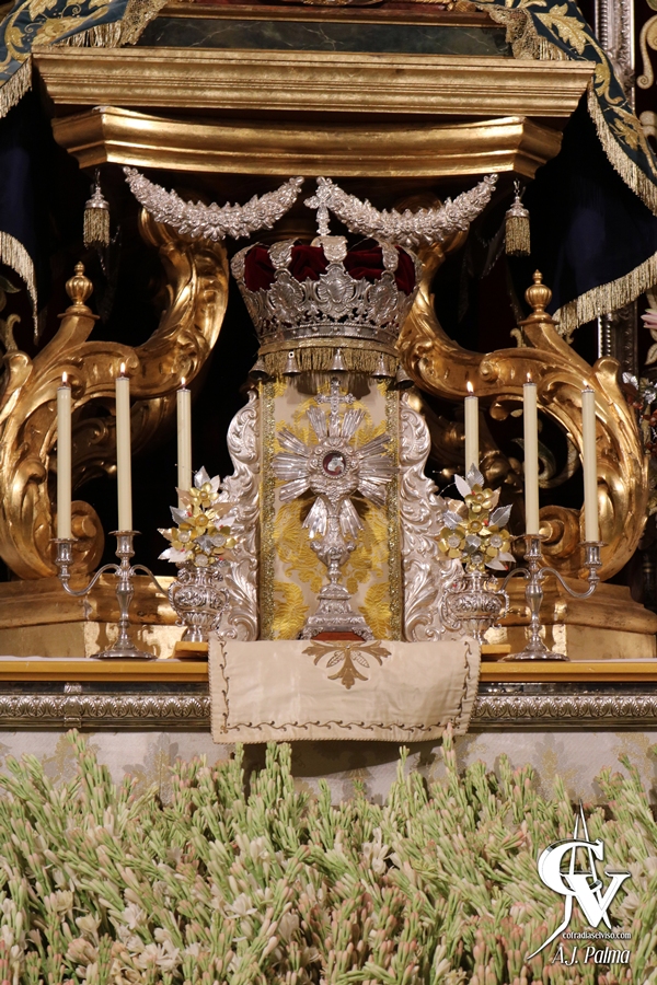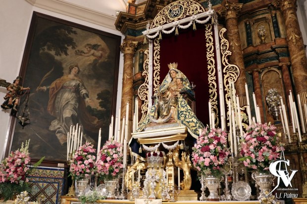 La priostía de la corporación de la Patrona de El Viso del Alcor montó para la ocasión un altar efímero con los elementos que caracterizan estos montajes en dicha Hermandad. Así, la Sagrada Imagen se encontraba elevada sobre una gran peana dorada de bella factura, estando cobijada por el dosel de cultos de esta corporación, con terciopelo burdeos con bordados y apliques en plata. La Santísima Virgen lucía el Manto de las Luces, estrenado el 12 de septiembre de 2024, portando el juego de coronas, cetro y bola del mundo que utilizaba hasta 2005 para su salida procesional, y luciendo distintos broches y joyas.