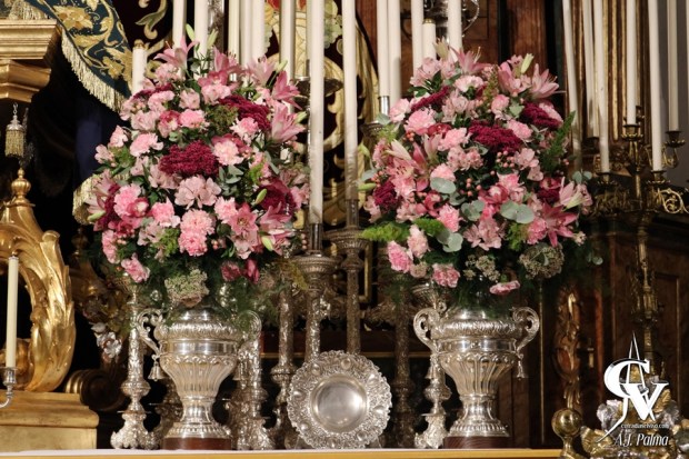 El altar tenía una gran cantidad de puntos de luz, distribuidos de forma simétrica. Éstos se colocaron a ambos lados de la Santísima Virgen, incluyendo candelabros antiguos flanqueando el altar, sobre pedestales marmóreos. En la base del altar se repartían cuatro jarras con un exorno floral compuesto por variedad de flores en tonos rosas, intercalando entre ellas distintas piezas de platería. Similares ramos se colocaron a los lados del montaje, en la parte de las barandas del presbiterio. Por su parte, un manifestador con la reliquia de Santa Ángela de la Cruz completaba el conjunto, estando ubicado a los pies de la peana de la Sagrada Imagen.