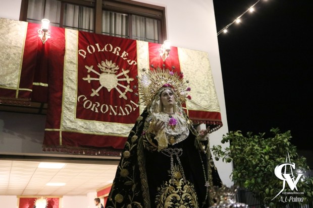 De esta forma, el itinerario seguido fue el previsto, transitando por Convento, Plaza Sacristán Guerrero, Horno, Rosario, Cervantes, La Laguna, Santa Ana, Corredera, Pozo, Isaac Peral, Hermanos Pinzón, Plaza de Cuba, Rodrigo de Triana, Tocina, Valdés Leal, Murillo, Plaza Julio Romero de Torres, Sorolla, Picasso, Joan Miró, Alcalde Gil López, María Santísima de la Esperanza y Avenida Blas Infante. En este trayecto la Virgen recorrió parte del Barrio de las Anchoas y del Barrio del Depósito del Agua, lugares por donde los vecinos e incluso algunos negocios decoraron las calles y fachadas con distintos altares que daban buena fe de la devoción de los vecinos de la localidad a Nuestra Señora de los Dolores.