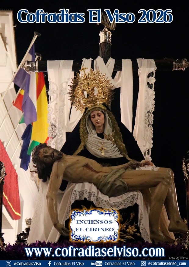 En la parte superior se puede leer en letras azules “Cofradías El Viso 2026” y en la parte inferior recoge la dirección web del portal cofrade y las redes sociales en una franja azul. Además, este cartel cuenta con la publicidad de Inciensos El Cirineo, a quien agradecemos su colaboración por tercer año consecutivo.