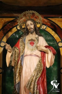 Se trata de una imagen de cuerpo entero, vestida con túnica blanca y capa roja, en la que destaca estampación floral de color dorado. Su mano derecha se adelanta y nos bendice; por el contrario, la derecha nos señala su pecho en el que aparece un corazón refulgente y llameante en el que aparece una cruz. Cristo está vivo, ha resucitado y vencido a la muerte.