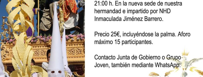 Un nuevo año, la Hermandad de la Sagrada Entrada impartirá un taller de palmas rizadas. Éste tendrá lugar entre el lunes 12 y el viernes 16 de marzo, en horario de 19:00 a 21:00 horas. La cita será en la nueva sede de la corporación del Domingo de Ramos, siendo impartido por Dña. Inmaculada Jiménez … Sigue leyendo Taller de Palmas Rizadas en la Hdad de la Sagrada Entrada