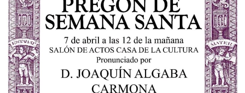 En la mañana del 7 de abril, Domingo de Pasión, tendrá lugar en nuestra localidad el Pregón de la Semana Santa de 2019, en la Casa de la Cultura a las 12:00 horas, a cargo de D. Joaquín Algaba Carmona. En el acto intervendrá la Banda de Música Santa María del Alcor, interpretando la marcha … Sigue leyendo Pregón de la Semana Santa 2019