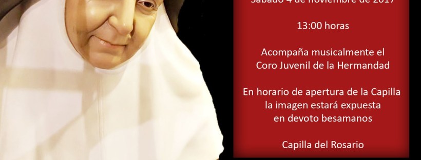 El próximo sábado 4 de noviembre la Hermandad de Vera-Cruz y Rosario celebrará Santa Misa y Besamanos a Santa Ángela de la Cruz en la Misa de las 13:00 horas. Esto se debe a que el próximo 5 de noviembre será la Festividad de Santa Ángela de la Cruz, por lo que la corporación del … Sigue leyendo Santa Misa y Besamanos a Santa Ángela de la Cruz 2017